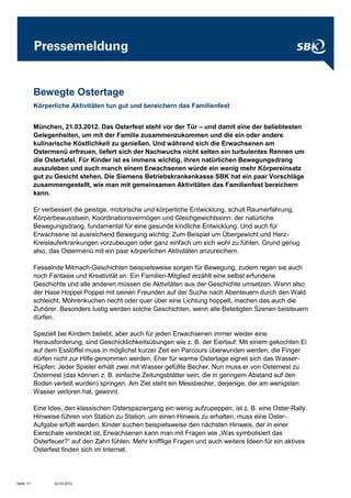 Das Dokument gibt Vorschläge für aktive körperliche Aktivitäten, um das Osterfest für Familien zu bereichern, wobei der Fokus auf der wichtigen Rolle von Bewegung für die gesunde Entwicklung von Kindern und das Wohlbefinden von Erwachsenen liegt. Empfohlene Aktivitäten sind unter anderem Mitmachgeschichten, Geschicklichkeitsübungen wie der Eierlauf und ein Oster-Rallye mit Aufgaben und Fragen. Zusätzlich wird die Siemens-Betriebskrankenkasse (SBK) vorgestellt, die als größte Betriebskrankenkasse in Deutschland tätig ist und mit über 1.300 Mitarbeitern einen hohen Kundenservice bietet.