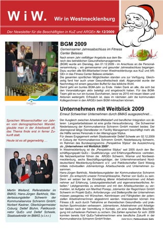 Der Newsletter für die Beschäftigten in Westmecklenburg blickt auf das Jahr 2009 zurück, das von wirtschaftlichen Herausforderungen, insbesondere der größten Rezession nach dem Krieg, geprägt war, aber auch positive Entwicklungen im Arbeitsmarkt zeigte. Die Notwendigkeit zur Fachkräftesicherung und der Einsatz von Kurzarbeit und Qualifizierungsmaßnahmen wurden hervorgehoben, während gleichzeitig ein gemeinsamer Jahresabschluss im Rahmen des betrieblichen Gesundheitsmanagements stattfand. Zudem wurde die Auszeichnung eines Schweriner Unternehmens für dessen Engagement zur Integration älterer Arbeitnehmer in den Arbeitsmarkt bekannt gegeben.