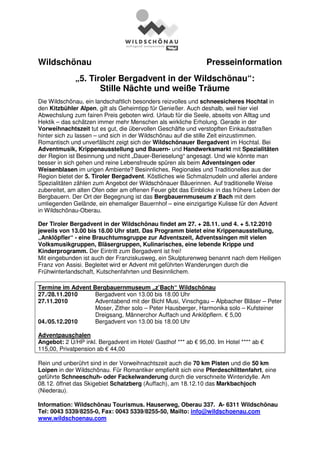 Der 5. Tiroler Bergadvent in der Wildschönau bietet eine besinnliche Vorweihnachtszeit mit regionaler Adventmusik, einer Krippenausstellung und einem Handwerksmarkt. Vom 27. November bis 5. Dezember 2010 können Besucher die traditionelle Atmosphäre im Bergbauernmuseum Z'bach genießen, bei kulinarischen Spezialitäten verweilen und an geführten Wanderungen teilnehmen. Der Eintritt ist frei und es werden auch spezielle Unterkunftspauschalen angeboten.