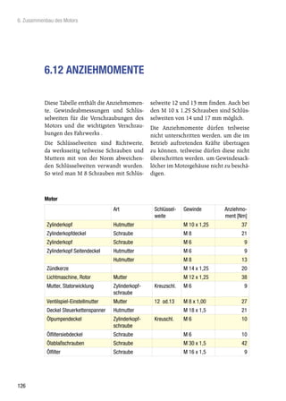 Das Dokument beschreibt den Zusammenbau eines Motors, insbesondere die Montage des Steuerkettenspanners und die korrekten Anziehmomente für verschiedene Schrauben und Muttern. Verschleiß und typische Schäden an Motor und Getriebe werden ebenfalls behandelt, wobei besondere Aufmerksamkeit auf die Ursachen und Auswirkungen von nicht optimal eingestellten Spannungen in der Steuerkette, sowie auf unterschiedliche Verschleißarten an Kurbelwelle, Ventilen und Kupplung gerichtet wird. Tabellen zu Anziehmomenten und detaillierte Bildbeschreibungen der einzelnen Teile unterstützen die technischen Anweisungen.