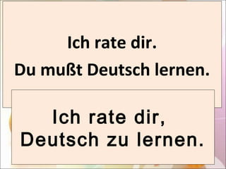 Das Dokument enthält Übungen zur Verwendung des Satzbaus 'verb + zu + infinitiv' im Deutschen. Es werden verschiedene Beispiele gegeben, in denen Ratschläge und Empfehlungen geäußert werden, wie z.B. das Lernen der deutschen Sprache oder das Kaufen einer Katze. Die Übungen zielen darauf ab, die grammatische Struktur und den Gebrauch des Infinitivs zu trainieren.