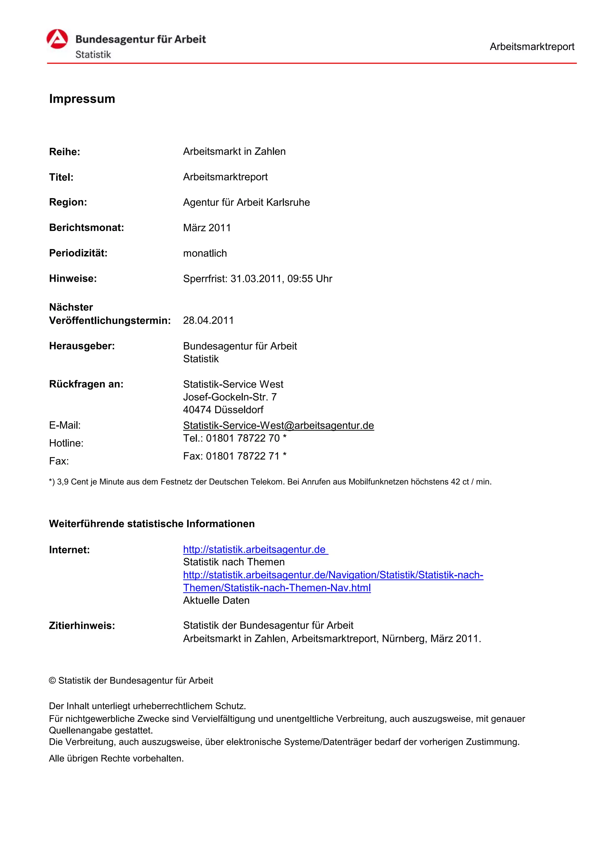 Der Arbeitsmarktreport der Agentur für Arbeit Karlsruhe für März 2011 zeigt einen leichten Rückgang der Arbeitslosenzahl um 2,6% im Vergleich zum Vormonat, mit insgesamt 16.830 Arbeitslosen. Die Arbeitslosenquote lag bei 4,5%, wobei Männer eine Quote von 4,5% und Frauen von 4,4% aufwiesen. In der Region wurden höhere Zugangszahlen zu Arbeitslosigkeit, insbesondere aus der Erwerbstätigkeit und Ausbildung, verzeichnet.