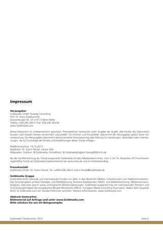 Der Goldmedia Trendmonitor 2014 bietet einen Ausblick auf relevante Entwicklungen in den Bereichen Medien, Internet, Telekommunikation und Entertainment in Deutschland. Wichtige Trends sind unter anderem die wachsende Bedeutung von Premium-Publishing, die Einführung von LTE-Broadcast für mobiles Fernsehen und eine erhöhte Sensibilisierung für Cyber-Sicherheit. Das Dokument stellt fest, dass trotz des zunehmenden Online-Konsums das Fernsehen weiterhin als Leitmedium bleibt, während digitale Bezahlmodelle in der Publishing-Branche an Bedeutung gewinnen.