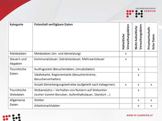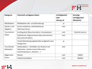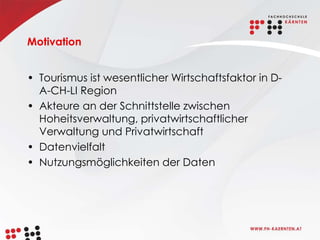 Das Dokument behandelt die Bedeutung von Open Government Data (OGD) für die Tourismusbranche in der D-A-CH-LI-Region und identifiziert potenzielle Datenquellen sowie Nutzungsmöglichkeiten. Es präsentiert ein Stufenmodell zur Analyse und Verknüpfung von Tourismusdaten und thematisiert zukünftige Herausforderungen wie die Verfügbarkeit und Bereitschaft zur Datenveröffentlichung. Ziel ist es, die Schnittstelle zwischen Verwaltung und Privatwirtschaft zu stärken und den Nutzen von Tourismusdaten zu bewerten.