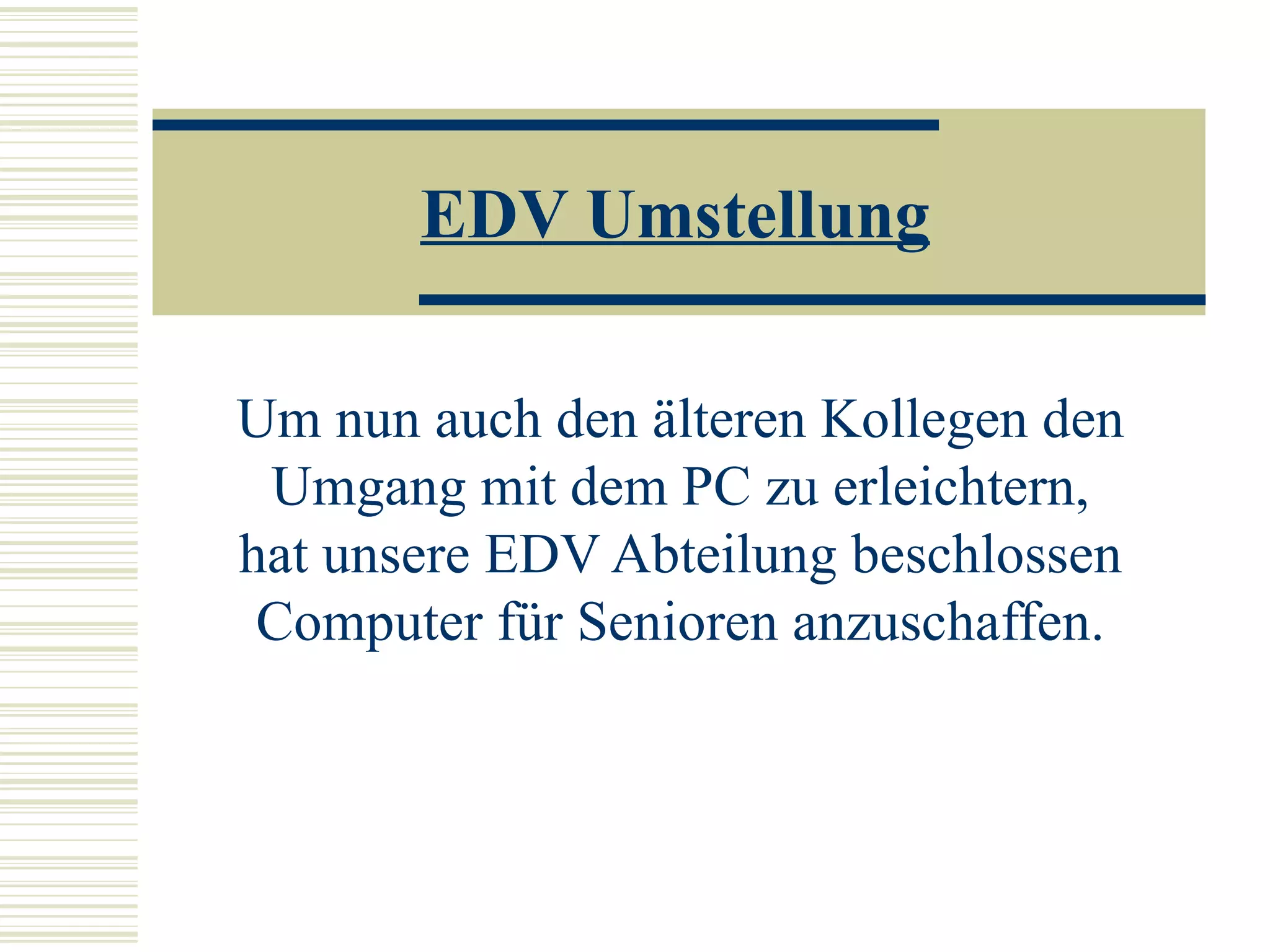 Die EDV-Abteilung plant die Anschaffung von Computern, um älteren Kollegen die Nutzung von PCs zu erleichtern. Es werden humorvolle Merkmale aufgelistet, die darauf hinweisen, dass man vor einem speziellen PC für Senioren sitzt, wie eine voreingestellte Homepage und ein 42-Zoll-Monitor. Ein besonders komisches Beispiel ist, dass nach 15 Minuten Untätigkeit automatisch der Notarzt gerufen wird.