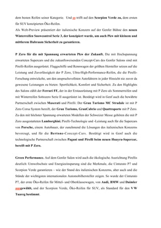 Der Genfer Autosalon 2011 präsentiert Pirelli mit einem Fokus auf umweltfreundliche und leistungsstarke Reifen, einschließlich der P Zero-Reihe für die Formel 1 und dem neuen Winterreifen Snowcontrol Serie 3. Pirelli bestätigt seine führende Rolle in der Automobilindustrie durch innovative Reifenlösungen, die auch von renommierten Automobilherstellern wie Ferrari und Maserati verwendet werden. Die neue Pirelli-Website bietet eine benutzerfreundliche Plattform zur Auswahl und Informationen über die gesamte Produktpalette.