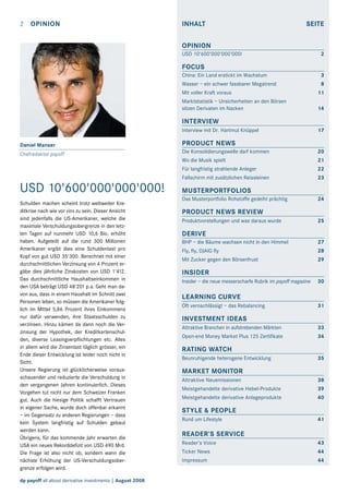 Das Dokument behandelt verschiedene Aspekte der finanziellen Situation sowie Herausforderungen in China, das trotz beeindruckendem Wachstum vor ernsthaften wirtschaftlichen und sozialen Problemen steht. Insbesondere wird auf die hohe Staatsverschuldung der USA und deren Auswirkungen eingegangen, während gleichzeitig auf die Schattenseiten des chinesischen Wachstums, wie Umweltverschmutzung und demografische Probleme, hingewiesen wird. Zudem werden innovative Anlageprodukte im Bereich der Derivate vorgestellt, die Investoren in diesem unsicheren Marktumfeld ansprechen sollen.
