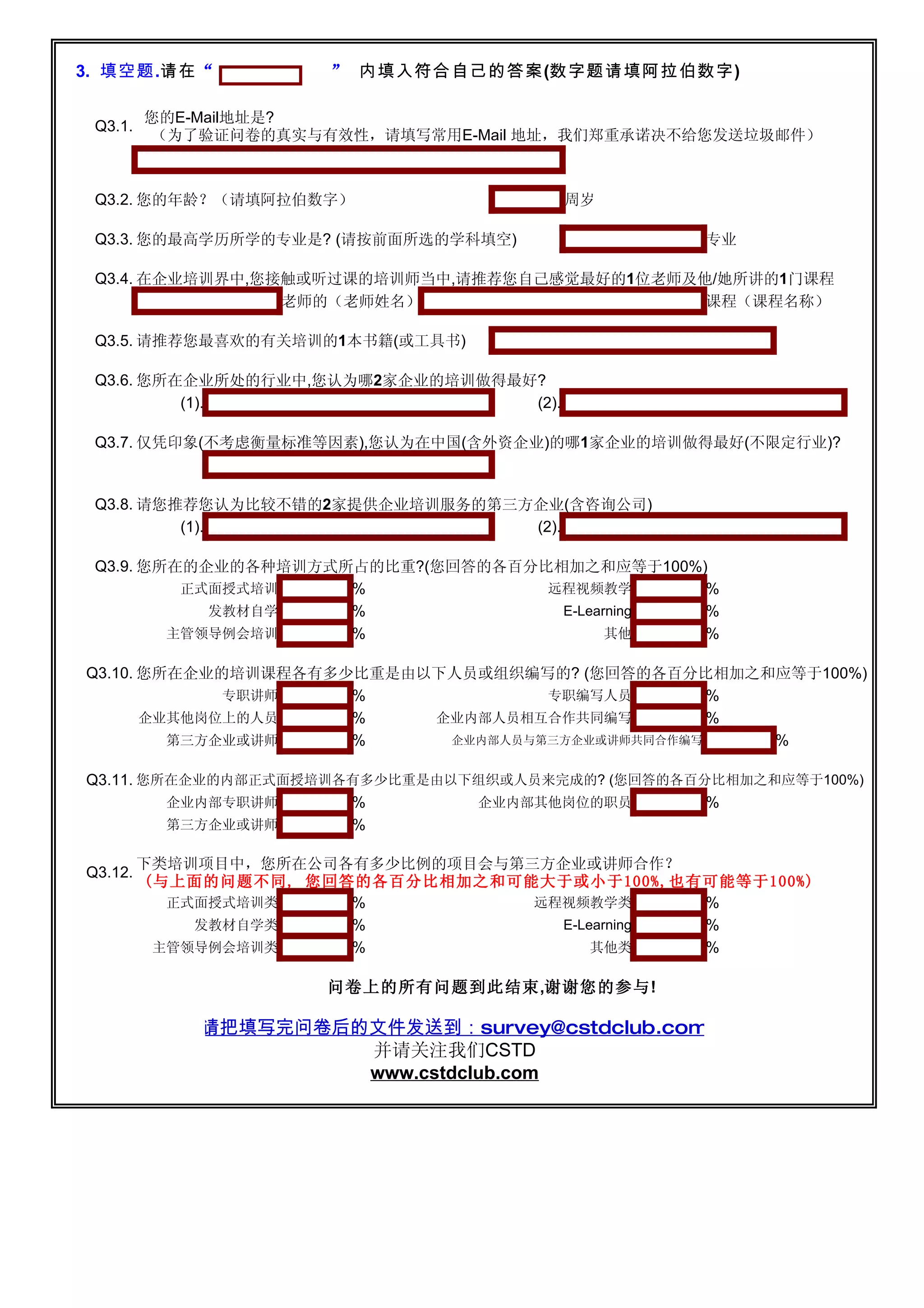 Das Dokument enthält eine Reihe von Fragen in einer Umfrage, die sich auf verschiedene Aspekte der Ausbildung und Schulung beziehen. Es werden Themen wie die effektivsten Lernmethoden, die Zufriedenheit mit den angebotenen Kursen und die bevorzugten Lehrformen behandelt. Die Antworten sollen aufschlussreiche Daten zur Optimierung der Bildungssysteme und -strategien liefern.