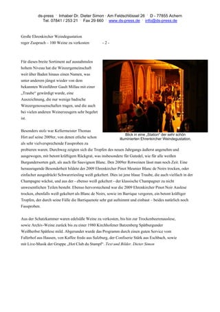 Die Ehrenkircher Weindegustation fand mit großer Teilnahme statt und bot die Verkostung von 100 Weinen vorgestellt von Kellermeister Thomas Hirt und Geschäftsführer Siegbert Ortlieb. Die Veranstaltung im romantischen Gewölbekeller erfreute sich auch internationaler Aufmerksamkeit, einschließlich Fachhändler aus Nordrhein-Westfalen, und die Weine wurden für ihre hohe Qualität ausgezeichnet, wie durch die Gault-Millau-„Traube“ gewürdigt. Besondere Highlights waren der 2009 Ehrenkircher Pinot Meunier Blanc de Noirs und der 2009 Ehrenkircher Pinot Noir Auslese, die beide mit ihrem kräftigen Charakter beeindruckten.