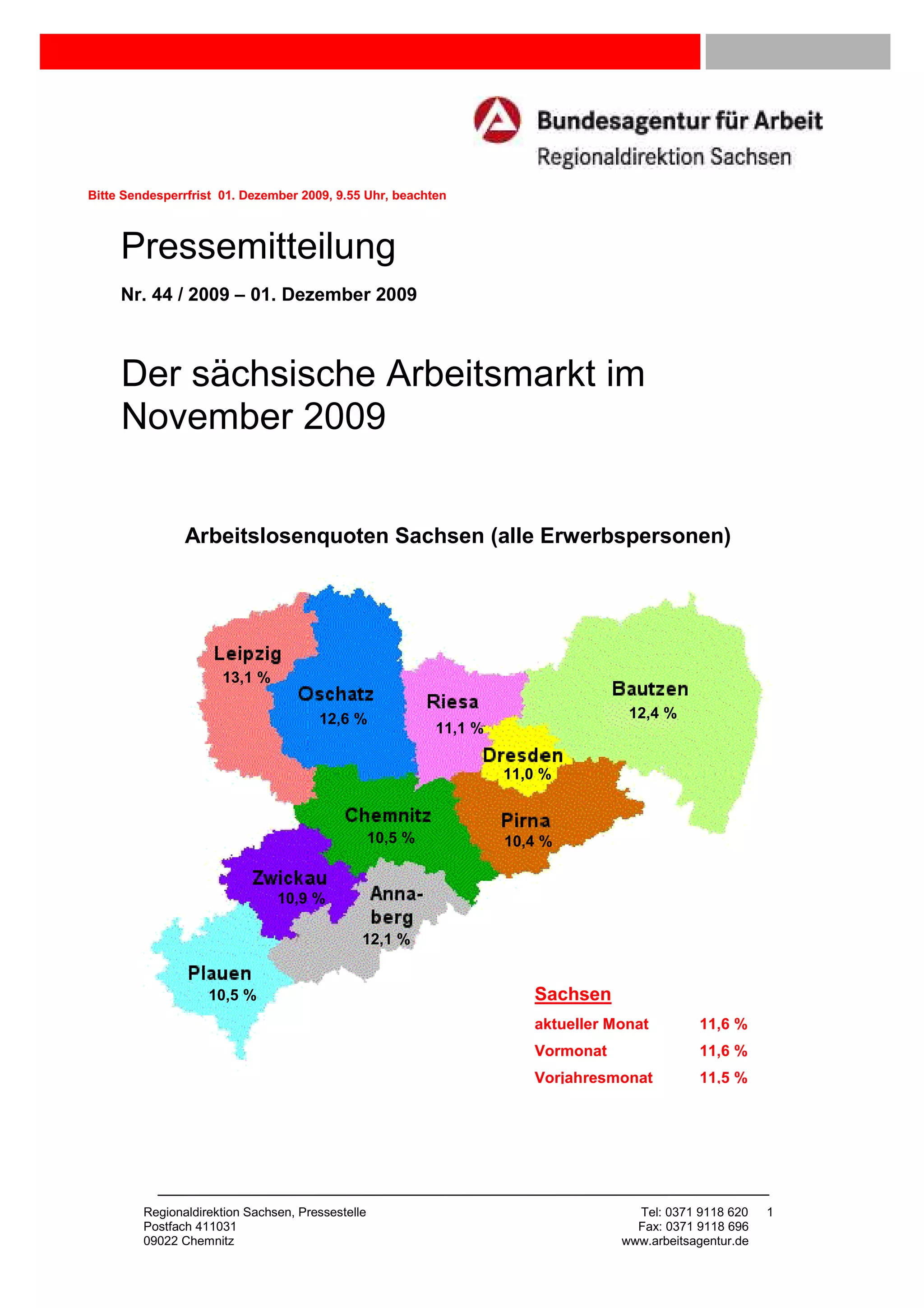 Im November 2009 lag die Arbeitslosenquote in Sachsen stabil bei 11,6 % mit 250.304 Arbeitslosen, was einen Rückgang um 0,1 % im Vergleich zum Vormonat darstellt. Trotz eines Anstiegs gegenüber dem Vorjahr um 0,6 % bleiben die Arbeitsmarktdaten im Großen und Ganzen stabil, wobei die Kurzarbeit in vielen Unternehmen weiterhin genutzt wird, um Entlassungen zu vermeiden. Die niedrigste Jugendarbeitslosigkeit seit 1998 wurde mit 26.350 jungen Arbeitslosen verzeichnet, während ältere Arbeitslose und Langzeitarbeitslosigkeit ebenfalls leichte Anstiege zeigten.