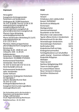 Die evangelische Kirche St. Peter in Partenheim feiert 2010 ihr 575-jähriges Bestehen mit verschiedenen Festveranstaltungen, darunter ein Festgottesdienst, ein Konzert und ein Gemeindefest. Der Text betont die historische Bedeutung der Kirche und ihre Rolle als spirituelles Zentrum für die Gemeinde. Zu den Jubiläumsaktivitäten gehört auch die Einführung eines speziell abgefüllten Kirchenweins zur Unterstützung der Gemeinde.