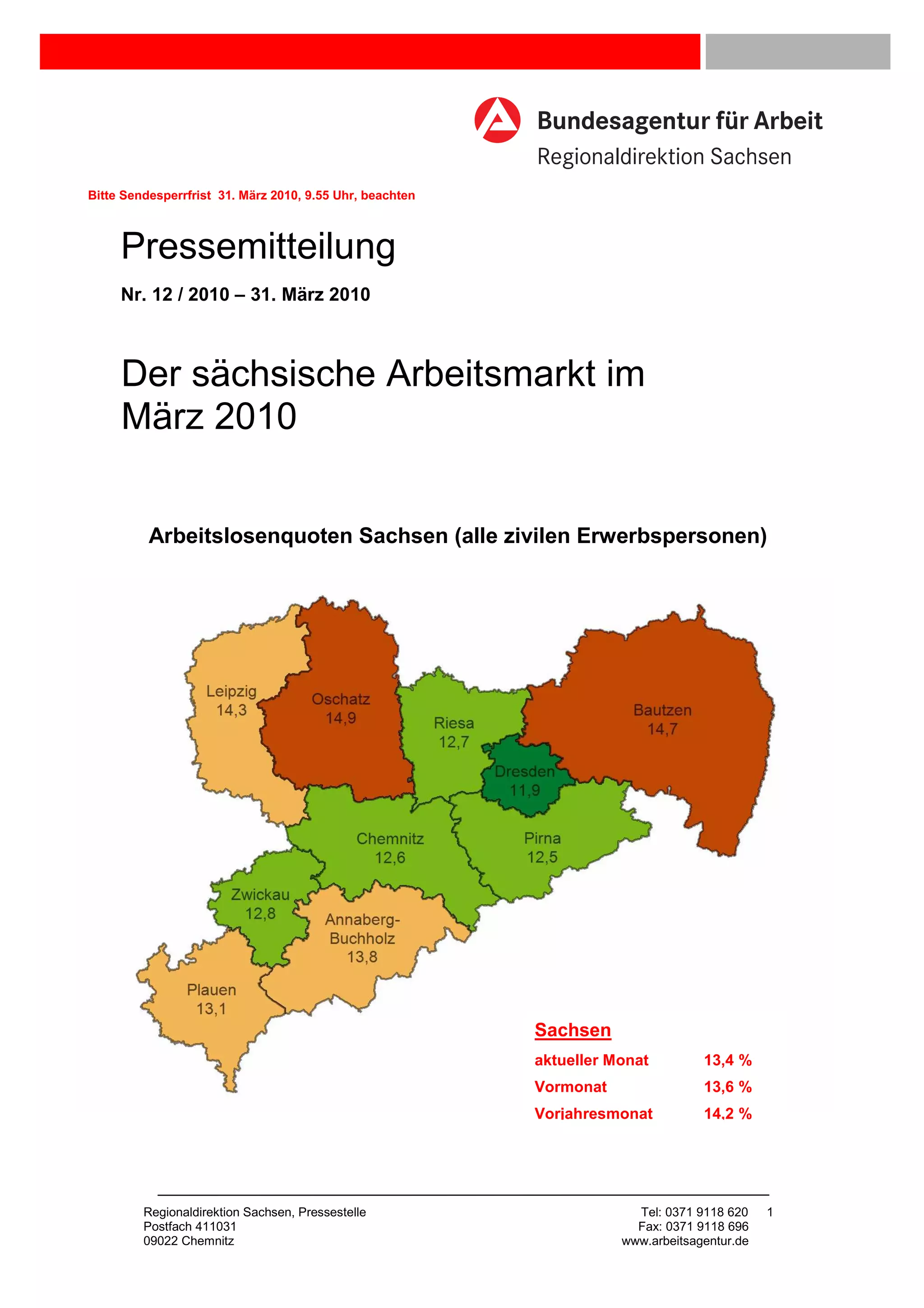 Im März 2010 ist die Arbeitslosenzahl in Sachsen auf 288.530 gesunken, was einer Arbeitslosenquote von 13,4 Prozent entspricht, und einen Rückgang von 1,2 Prozent gegenüber dem Vormonat und 6,1 Prozent im Jahresvergleich darstellt. Besonders in den Bau- und Agrarberufen kam es zu einem Anstieg an Neueinstellungen, wodurch die Arbeitslosigkeit über die saisonalen Einflüsse hinaus gesenkt wurde. Trotz eines Rückgangs der sozialversicherungspflichtigen Beschäftigung um 1,4 Prozent ist der Arbeitsmarkt in Sachsen weiterhin robust, mit 7.977 gemeldeten offenen Stellen im März.