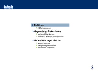 Das Dokument behandelt 14 Jahre Erfahrungen im Bereich Keyword Advertising, einschließlich der Herausforderungen des gegenwärtigen Marktes und der künftigen Entwicklungen. Es thematisiert verschiedene Aspekte wie die Nutzung von Marken, unlauteres Abfangen von Kunden und die Einflüsse mobiler Endgeräte auf Suchverhalten. Zudem werden rechtliche Differenzierungen und die Auswirkungen von Behavioral Advertising auf die Nutzererfahrung analysiert.