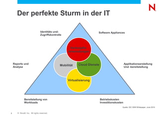 Das Dokument behandelt das intelligente Workload-Management im Kontext des Cloud-Computing und hebt die Herausforderungen sowie Lösungen für ein effektives IT-Management hervor. Es wird auf die Notwendigkeit der Flexibilität und Kontrolle sowie die Rolle von Sicherheit und Compliance eingegangen. Zudem wird der Novell Cloud Manager als Werkzeug zur effizienten Verwaltung von Workloads und zur Unterstützung der Geschäftsdienstleistungen präsentiert.