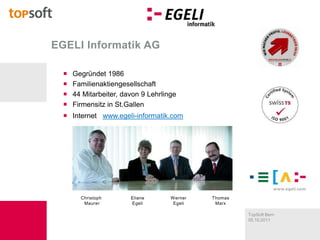 Das Dokument beschreibt die Dienstleistungen der Egeli Informatik AG, einschließlich individueller Softwareentwicklung und Integrationen mit Microsoft Dynamics CRM/XRM sowie SharePoint. Es werden Lösungen für Kreditmanagement, Bonitätsprüfung und den Umgang mit Debitoren vorgestellt, sowie die hohen Anpassungsmöglichkeiten der CRM-Software für Marketing und Vertrieb. Ziel ist es, alle geschäftsrelevanten Informationen im CRM verfügbar zu machen und den Aufwand für Fakturierung und Debitorenbuchhaltung signifikant zu reduzieren.
