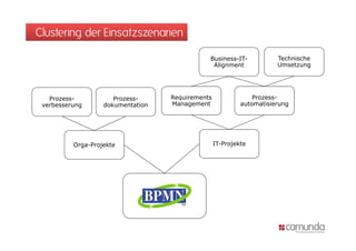 Das Dokument beschreibt die Integration von BPMN-Tools für das Prozessmanagement in Unternehmen, einschließlich Zielsetzungen wie Prozessdokumentation, Schulung neuer Mitarbeiter und ISO-Zertifizierung. Es werden Methodiken, Werkzeuge und Best-Practice-Guidelines für die Modellierung, das Automatisieren und die Veröffentlichung von Prozessen thematisiert. Zudem werden Anforderungen an BPMN-Modeler sowie verschiedene Anbieter und deren Lösungen vorgestellt.