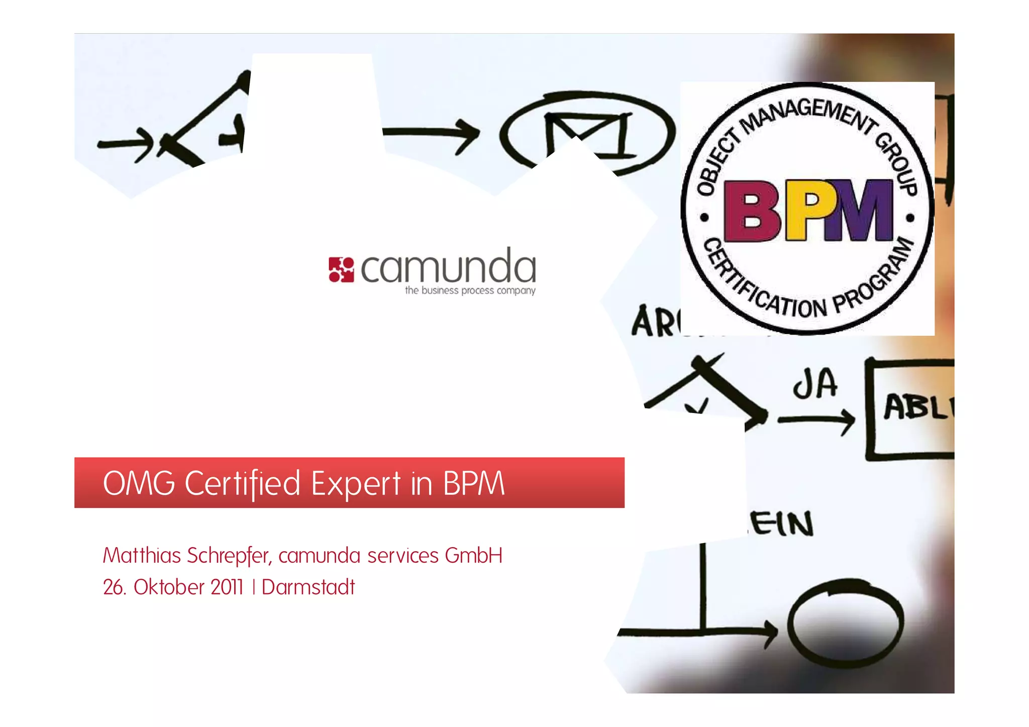 Das Dokument beschreibt das OMG Certified Expert in BPM (OCEB) Programm, das eine Zertifizierung im Bereich Geschäftsprozessmanagement (BPM) bietet und auf internationalen Standards basiert. OCEB beinhaltet verschiedene Zertifizierungsstufen und thematische Schwerpunkte, die für unterschiedliche Zielgruppen, wie Fachleute und Unternehmen, relevant sind. Die Prüfung erfolgt in einem Online-Testcenter als Multiple-Choice-Test und es werden Vorbereitungskurse angeboten, um die Teilnehmer auf die Zertifizierung vorzubereiten.