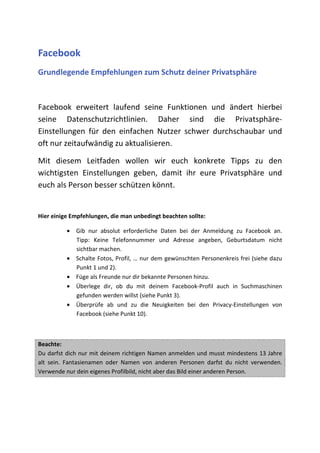 Der Leitfaden bietet grundlegende Empfehlungen, um die Privatsphäre in sozialen Netzwerken, insbesondere auf Facebook, zu schützen. Nutzer sollten nur notwendige Daten eingeben, ihre Profileinstellungen regelmäßig überprüfen und die Sichtbarkeit ihrer Inhalte anpassen. Zudem wird auf die Risiken von Cybermobbing hingewiesen und Tipps gegeben, wie man sich davor schützen und im Falle eines Vorfalls handeln kann.