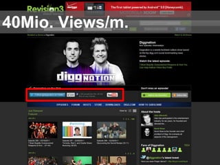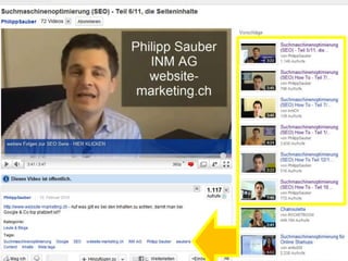Das Dokument behandelt den Erfolg von Imagefilmen und deren Verbreitung über Plattformen wie YouTube. Es werden Statistiken zu Views, Abonnenten und der Bedeutung von SEO und SMO für die virale Verbreitung von Inhalten präsentiert. Zudem wird auf die Optimierung von Videos, Titel und Tags eingegangen sowie auf die Rolle von Social Bookmarks und Empfehlungen zur Steigerung des Traffics.