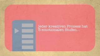 Der kreative Prozess besteht aus fünf emotionalen Stufen: Möglichkeiten, Zweifel, Todeskampf, Erleuchtung und Fertigkeit, die verwendet werden, um kreative Blockaden zu überwinden. Jeder Schritt hat seine eigenen Herausforderungen, von anfänglichem Spaß bis hin zu ernsthaften Selbstzweifeln, doch das Überstehen dieser Phasen führt zur Entwicklung faszinierender Ideen. Kreativität erfordert Zeit und Raum für Misserfolge und Entdeckungen, um letztendlich bedeutungsvolle Ergebnisse zu erzielen.