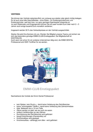 Das Dokument beschreibt die Geschäftsmöglichkeit für selbstständige Vertriebspartner im Direktvertrieb von Emmi-Dental Professional, einer patentierten Ultraschallzahnbürste, die durch Reinigungstechnologie Zahnprobleme verhindern soll. Die Zahnbürste entfernt Bakterien bis in 12 mm Tiefe, fördert die Mundhygiene und bietet eine risikoarme Geschäftseröffnung mit einer hohen Gewinnmarge für Vertriebspartner. Interessierte können sich kostenlos als Mitglied anmelden und haben die Chance, durch den Verkauf der Zahnbürsten ein stabiles Einkommen zu generieren.