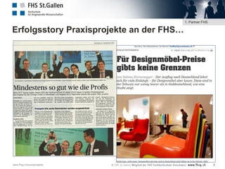 Die Wissenstransferstelle WTT-FHS an der Fachhochschule St. Gallen ermöglicht Studierenden praxisnahe Projekte in Zusammenarbeit mit Unternehmen, um ihre theoretischen Kenntnisse anzuwenden und praktische Erfahrungen zu sammeln. Jährlich werden etwa 240 Projekte durchgeführt, in denen die Studierenden Unternehmensanalysen, Marktforschungen und Managementkonzeptionen erstellen, unterstützt von Dozierenden. Die Projekte bieten sowohl nationale als auch internationale Perspektiven und tragen zur Vernetzung von Studierenden, Wirtschaft und Wissenschaft bei.