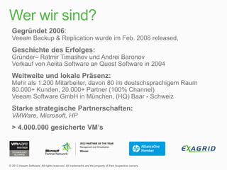 Das Dokument beschreibt die Funktionen und Technologien von Veeam-Backup-Lösungen, einschließlich schneller, inkrementeller Backups durch Change-Block-Tracking und agentenlose Verarbeitung. Es hebt die Effizienz der Datenspeicherung mit Deduplizierung und Komprimierung hervor sowie die Möglichkeit der sofortigen Wiederherstellung von virtuellen Maschinen aus Backup-Dateien. Die patentierte Veeam vPower-Technologie ermöglicht den direkten Zugriff auf Backup-Inhalte, wodurch eine zuverlässige und einfache Verwaltung der Backups gewährleistet ist.