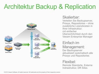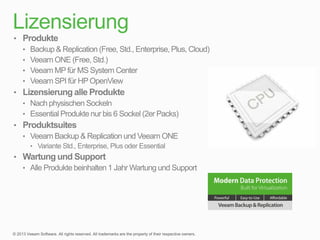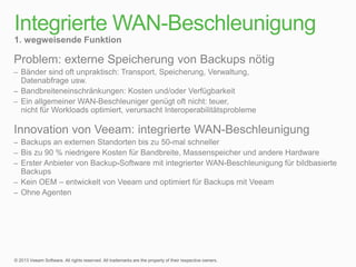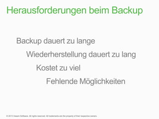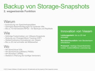 Das Dokument beschreibt die Funktionen der Veeam Backup-Lösung, die schnelle, effiziente und zuverlässige image-basierte Backups ermöglicht. Die Technologie nutzt fortschrittliches Change-Block-Tracking und bietet instant recovery sowie Agentenlosigkeit. Zudem gewährleistet die patentierte vPower-Technologie eine einfache Wiederherstellung virtueller Maschinen direkt aus Backup-Dateien.