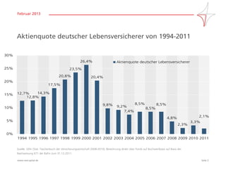 Das Dokument analysiert Marktchancen und Aktienquoten deutscher Lebensversicherer von 1994 bis 2011, wobei ein Rückgang in der Zahl deutscher Aktionäre und den deutschen Aktienumsätzen festgestellt wird. Der Investor Confidence Index zeigt einen Pessimismus nahe dem Allzeittief, und es gibt einen Trend zum Abziehen von Kapital aus Aktien und Hinzukäufen von Anleihen. Internationale Bewertungen von Ländern und Sektoren werden ebenfalls dargestellt, wobei unterschiedliche Kurs-Gewinn-Verhältnisse hervorgehoben werden.