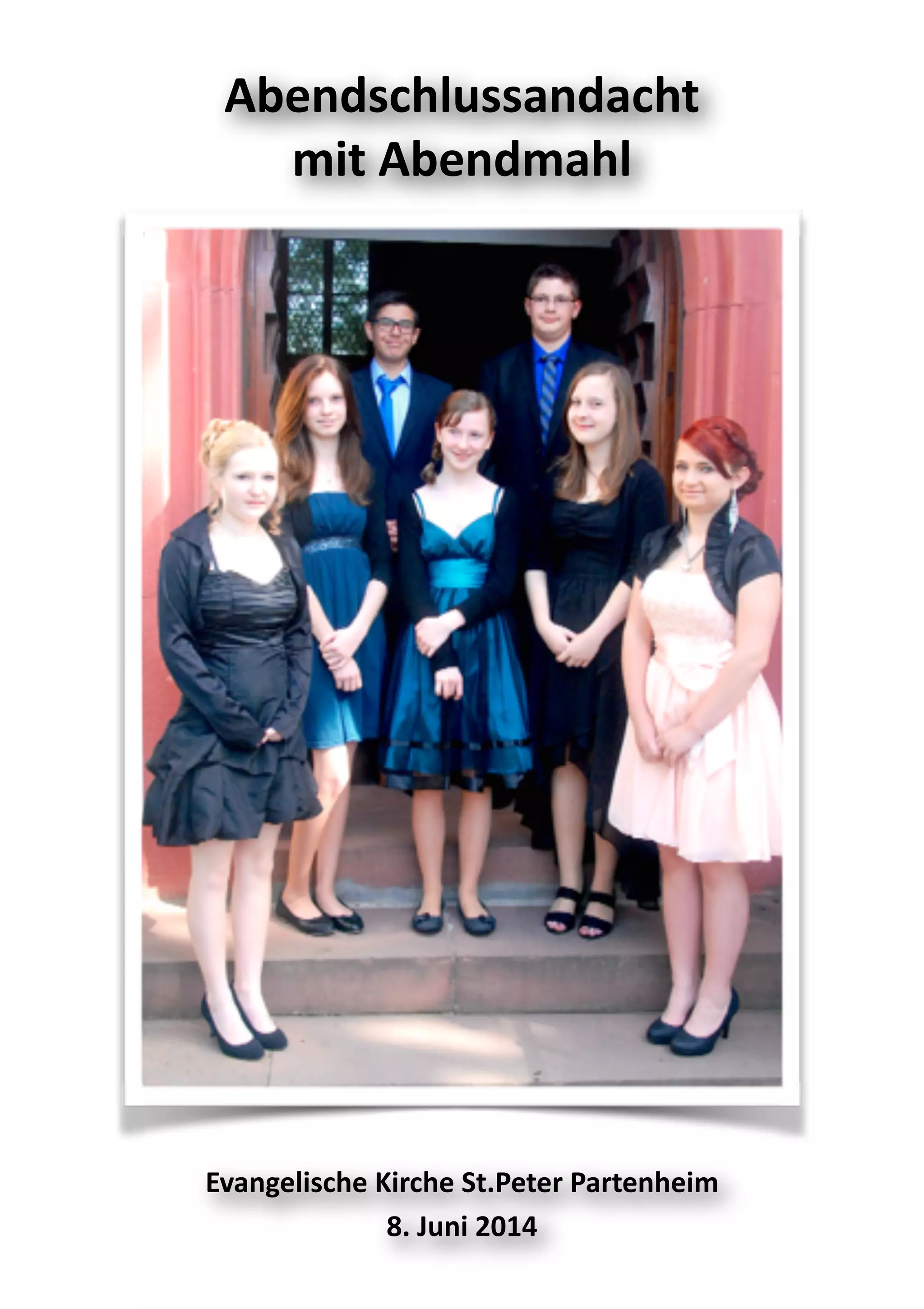 Die Abschlussandacht mit Abendmahl der evangelischen Kirche St. Peter in Partenheim am 8. Juni 2014 umfasst Gebete, Musik, Bibellesungen und persönliche Reflexionen der Konfirmierten, die ihren Übergang ins Erwachsenenleben feiern. In der Andacht steht die Gemeinschaft im Mittelpunkt, während das Abendmahl als Symbol für die Stärkung durch Gott und die Verbundenheit untereinander dient. Die Feier schließt mit Segen und Dankgebeten, die die Teilnehmer ermutigen, ihren Weg im Glauben zu gehen.