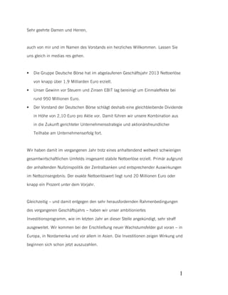 Die Deutsche Börse AG berichtete auf ihrer Bilanzpressekonferenz für 2013 von stabilen Nettoerlösen von über 1,9 Milliarden Euro und einem bereinigten EBIT von etwa 950 Millionen Euro, wobei eine Dividende von 2,10 Euro pro Aktie vorgeschlagen wird. Trotz herausfordernder wirtschaftlicher Bedingungen wurden signifikante Investitionen in Wachstum getätigt, insbesondere in Europa, Nordamerika und Asien, was sich bereits auszahlt. Die Unternehmensstrategie fokussiert sich auf Diversifizierung und Expansion in neue Märkte sowie auf das Clearing außerbörslicher Derivate und ein verbessertes Liquiditätsmanagement.