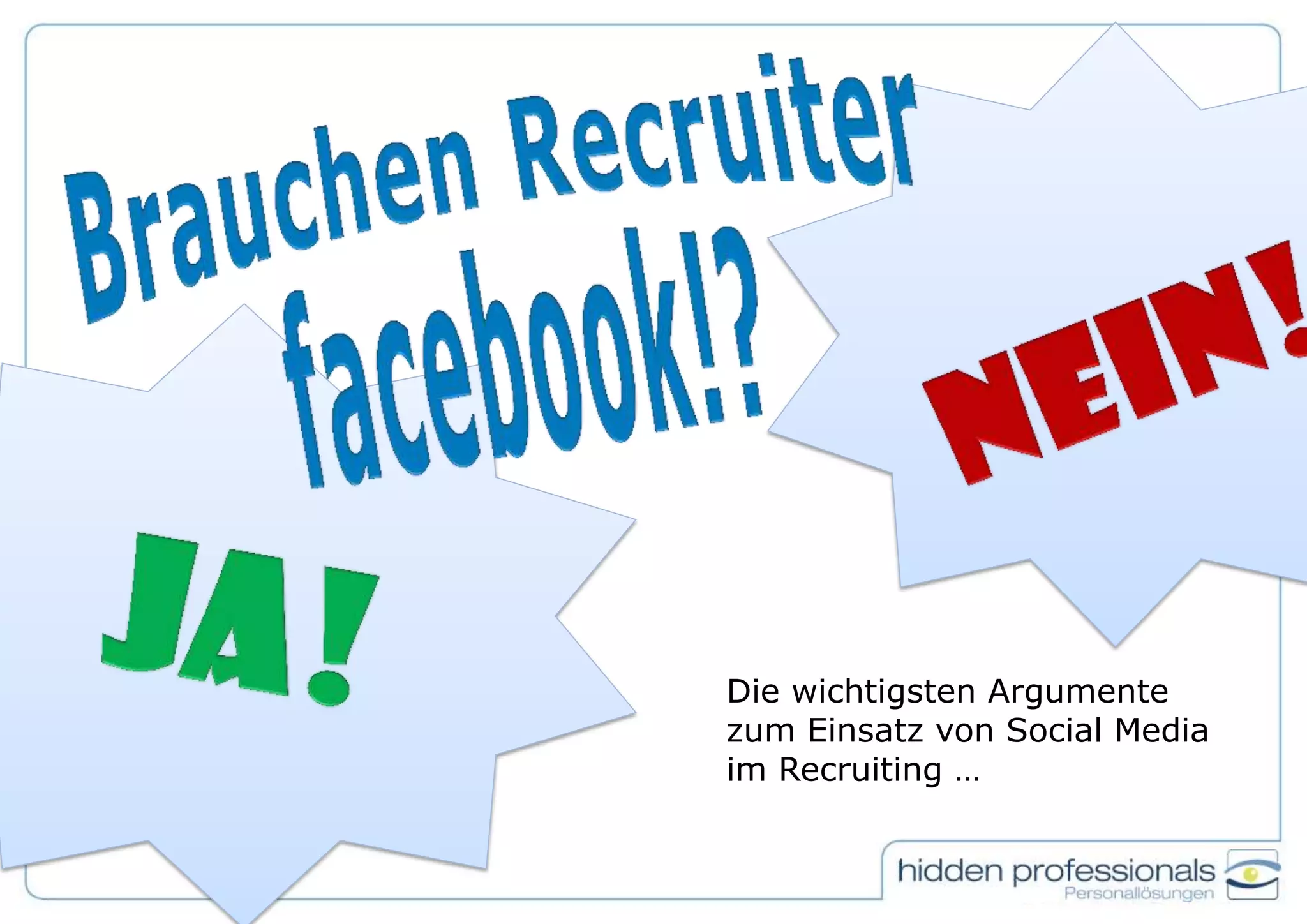 Das Dokument beschreibt die Vor- und Nachteile von Social Media im Recruiting und präsentiert sieben Argumente für den Einsatz, darunter die aktuelle Relevanz und die Möglichkeit, ein modernes Arbeitgeberimage zu fördern. Gleichzeitig werden sechs Argumente gegen die Nutzung aufgeführt, wie mangelnde Relevanz der Zielgruppen und hohe Anforderungen an die Pflege der Plattformen. Es wird empfohlen, zuerst die eigene Unternehmensidentität zu klären und Stellenanzeigen zu optimieren, bevor Social Media genutzt wird.