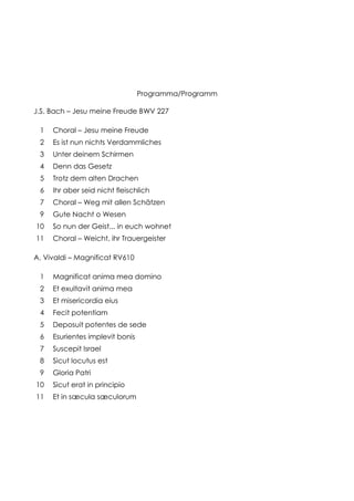 Das Dokument beschreibt ein geistliches Konzert, das am 6. Juni 2015 im Musikkonservatorium "C. Monteverdi" in Bozen stattfand. Das Programm umfasst Werke von J.S. Bach und A. Vivaldi, aufgeführt von Solisten und einem Chor unter der Leitung von Prof. Marco Simoncini. Die Aufführung beinhaltet unter anderem Bachs "Jesu meine Freude" BWV 227 und Vivaldis "Magnificat" RV 610.