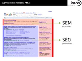 Das Dokument beschreibt die berufliche Erfahrung in SEO/SEM und Social Media Marketing, beginnend im Jahr 2002. Es enthält wichtige Richtlinien und Strukturen für gutes SEO sowie Empfehlungen für die Gestaltung effektiver Artikel, die sowohl Suchmaschinen als auch Leser ansprechen. Zudem wird auf die Bedeutung von Social Media Plattformen und deren Auswahl eingegangen.
