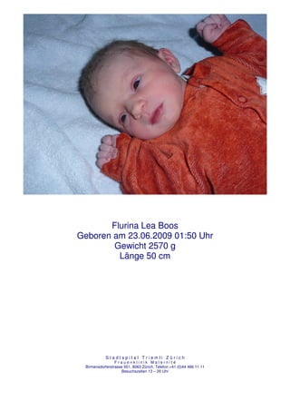 Flurina Lea Boos wurde am 23.06.2009 um 01:50 Uhr im Stadtspital Triemli Zürich geboren. Sie wiegt 2570 g und ist 50 cm lang. Die Kontaktinformationen der Frauenklinik sind: Maternité Birmensdorferstrasse 501, 8063 Zürich, Telefon +41 (0)44 466 11 11, Besuchszeiten 13 – 20 Uhr.