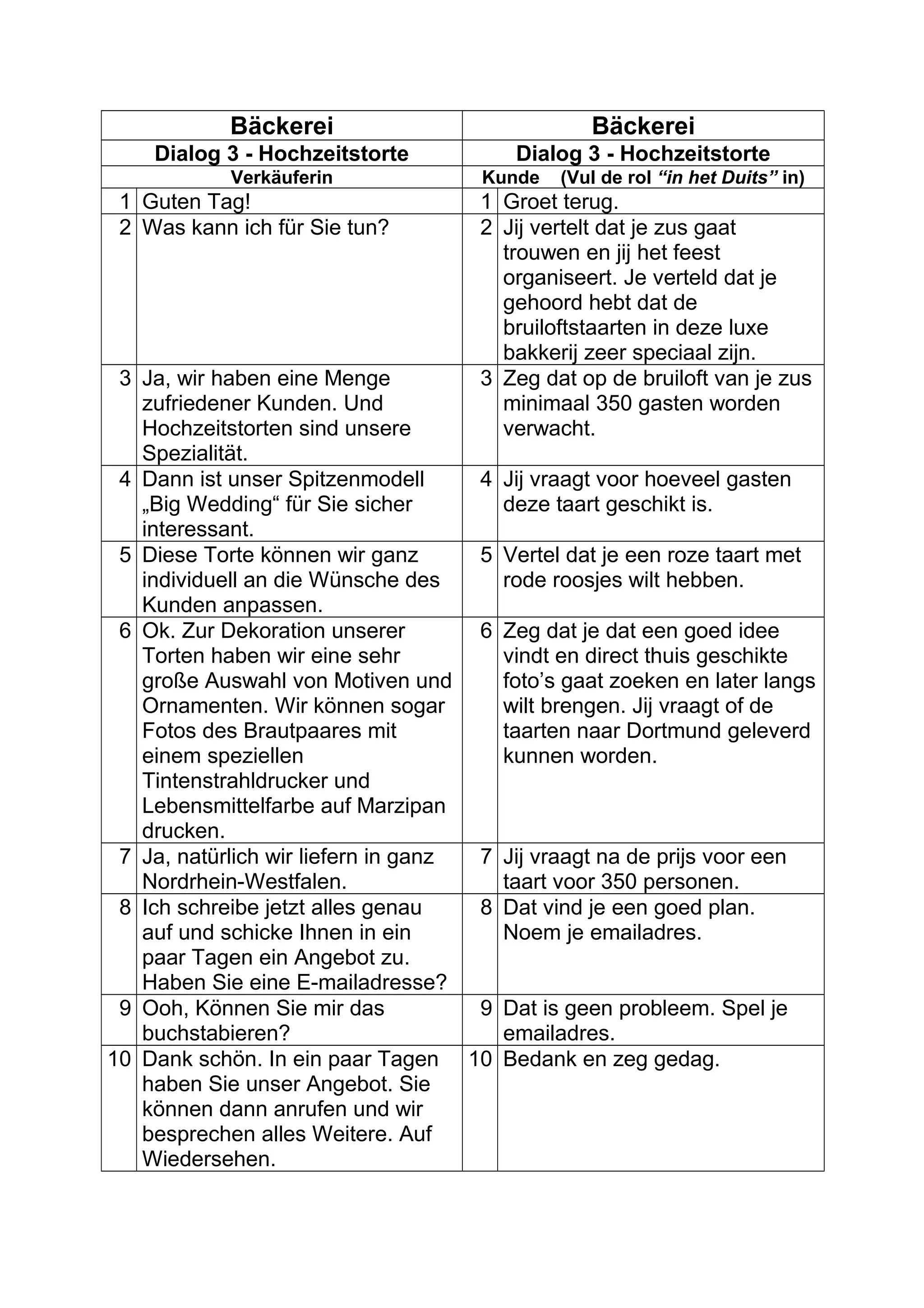 In einem Dialog zwischen einer Verkäuferin und einem Kunden wird diskutiert, dass der Kunde eine Hochzeitstorte für die bevorstehende Hochzeit seiner Schwester bestellt. Die Verkäuferin bietet verschiedene Anpassungsmöglichkeiten an, einschließlich der Möglichkeit, Fotos des Brautpaares auf der Torte zu drucken. Schließlich bestätigt der Kunde seine E-Mail-Adresse für den weiteren Kontakt und die Preisgestaltung für eine Torte für 350 Personen wird in den nächsten Tagen zugesandt.
