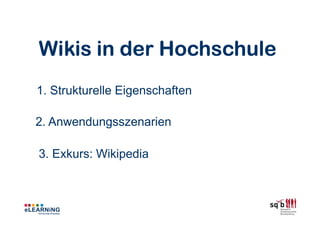 Das Dokument behandelt die Nutzung von Wikis in der Hochschule, einschließlich ihrer strukturellen Eigenschaften und Anwendungsszenarien wie kollaboratives Schreiben und Wissensressourcen. Es hebt die Vorteile der 'radikalen Kollaboration' und die Förderung von wissenschaftlichem Arbeiten hervor, während es auch auf Herausforderungen und kritische Aspekte, wie die Bedienbarkeit und soziale Validierung, eingeht. Schließlich werden Beispiele für erfolgreiche Wiki-Projekte in der akademischen Umgebung präsentiert.
