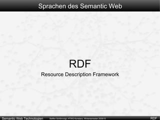 Das Dokument behandelt Semantic Web Technologien, insbesondere das Resource Description Framework (RDF) als bevorzugtes Datenmodell, welches graphenbasierte Strukturen anstelle von hierarchischen Baumstrukturen verwendet. Es werden die Komponenten von RDF wie Ressourcen, Literale und Eigenschaften erläutert, sowie die verschiedenen Serialisierungsformate wie RDF/XML und Turtle beschrieben. Zudem werden Probleme und Lösungen bei der Verarbeitung und Speicherung von RDF-Daten thematisiert.