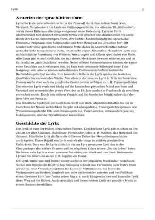 Lyrik ist eine der drei poetischen Gattungen und bezeichnet gediegene Dichtung, die häufig musikalisch und symbolisch ist. Die Entwicklung der Lyrik umfasst historische, sprachliche und formale Veränderungen, wobei verschiedene Stilmittel und Strukturen von großer Bedeutung sind. In der modernen Zeit ist die Beziehung zwischen Lyrik und populärer Musik, wie Rap und Poetry-Slam, sowie der Rückgang des Lyrikinteresses in der modernen Gesellschaft zu beobachten.