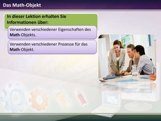 Das Dokument beschreibt das Math-Objekt in Microsoft Small Basic, welches eine Vielzahl von mathematischen Funktionen und Prozessen bietet, wie z.B. sin, cos, log und getrandomnumber. Es erklärt, wie diese Funktionen in Programmen verwendet werden können, um komplexe Berechnungen durchzuführen und zufällige Werte zu generieren. Abschließend werden Anwendungen wie das Erstellen von Programmen für geometrische Berechnungen und das Zeichnen von Formen im Grafikfenster vorgestellt.