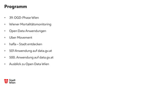 Das Dokument beschreibt das Programm des 39. Open Data Meetups und Talks in Wien am 25. Juni 2020, das verschiedene Themen rund um Open Data und neue Anwendungen behandelt, einschließlich des Wiener Mortalitätsmonitorings und neuer Geo-Datensätze. Es werden verschiedene Open Data-Anwendungen vorgestellt, wie die Bäderampel und die Uber Movement Plattform, die zur Analyse von Mobilitätsdaten in der Stadt genutzt werden. Zudem informiert es über geplante Termine und Veranstaltungen im Rahmen der Open Data-Initiativen in Wien.