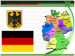 Das Dokument ist eine Präsentation über Deutschland für den 4. Schuljahrgang, in der Informationen zur Geographie, zur Flagge, zu den Nachbarländern und zu den Bundesländern gegeben werden. Es werden auch kulturelle Aspekte wie berühmte deutsche Schriftsteller und Komponisten erwähnt. Darüber hinaus wird das Klima und die Landschaft Deutschlands beschrieben.
