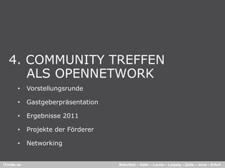 Das Dokument beschreibt die Aktivitäten und Ergebnisse der IT-Community itmitte.de sowie deren Networking-Veranstaltungen, einschließlich eines Community-Treffens. Es enthält Statistiken zu Partnern, Zugriffsquellen und Marketingstrategien für Jobangebote in der Region. Zudem werden verschiedene Projekte und Kooperationen mit Bildungseinrichtungen sowie geplante Veranstaltungen hervorgehoben.