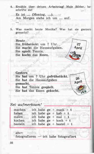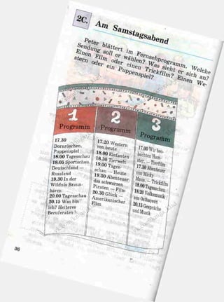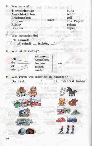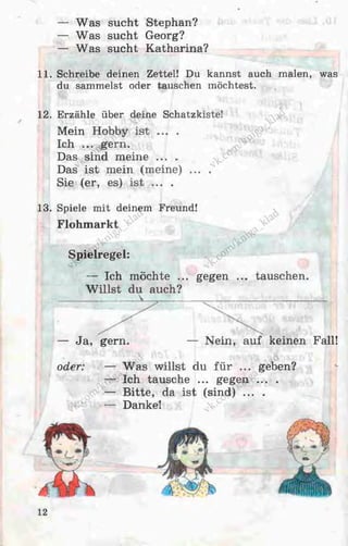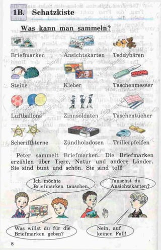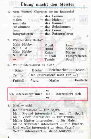 Das Dokument beschreibt verschiedene Hobbys von Personen, wie Briefmarkensammeln, Malen und Tennis spielen. Es behandelt auch die Interaktion über Hobbys und Interessen, sowie die Vorstellung von alltäglichen Tätigkeiten und Märchen, einschließlich eines kleinen Hundes, der seine Identität sucht. Am Ende wird eine Übung zur Reflexion über die persönlichen Hobbys und eine typische Woche thematisiert.