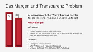 Das Dokument beschreibt die Herausforderungen von Freelancern im Recruitment, einschließlich intransparenter Vermittlungsaufschläge und ineffizientem Matching, die zu geringeren Projektvolumina und Qualitätsmängeln führen. 4freelance bietet Lösungen wie reduzierte Vermittlungsprovisionen und die Bildung einer Gemeinschaft von Freelancern, um bessere Projektanfragen und Transparenz zu gewährleisten. Besondere Relevanz hat das Dokument durch die aktuellen wirtschaftlichen Rahmenbedingungen, die den Druck auf Freelancer und Recruitingagenturen erhöhen.