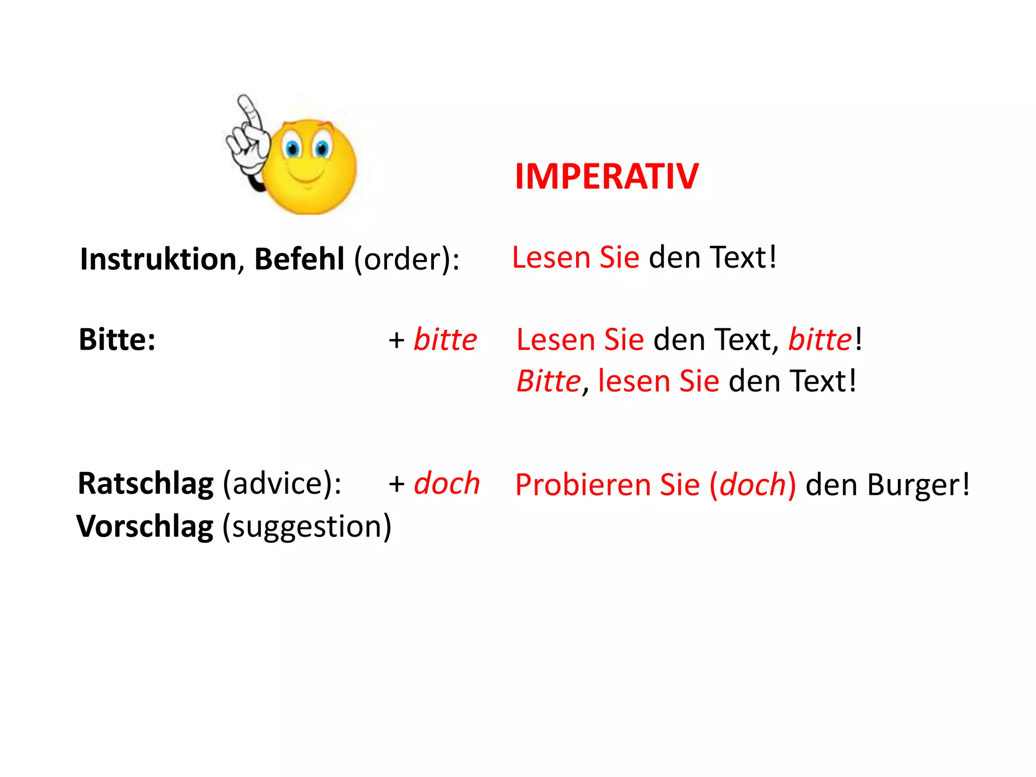 Das Dokument enthält eine Übersicht über imperativische Formen von Verben in der deutschen Sprache, einschließlich Anweisungen, Ratschlägen und Vorschlägen für Singular und Plural. Beispiele werden für die Verben 'kommen', 'geben', 'schlafen' und 'nehmen' gegeben, wobei jeweils die imperativen Formen aufgeführt sind. Zu den besprochenen Formen gehören sowohl die höfliche Anrede als auch die informellen Ansprachen.