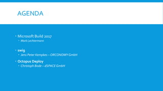 Das Dokument ist die Agenda für das 7. Treffen der .NET User Group, das am 10.10.2017 stattfindet. Es behandelt Themen wie .NET Core, Angular, Kubernetes und neue Features von Visual Studio 2017 sowie aktuelle Entwicklungen bei Microsoft und Azure-Diensten. Darüber hinaus werden die Teilnehmer ermutigt, Vorschläge zu Themen und Vorträgen einzureichen.
