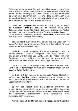 Das Dokument erklärt, dass Gedanken Ausstrahlungen aus dem geistigen Reich sind, die vom Menschen je nach Willen aufgenommen oder abgelehnt werden können. Der Mensch hat die Fähigkeit, diese Gedanken zu verarbeiten, jedoch ist er nicht der Urheber seiner eigenen Gedanken, sondern empfängt sie aus einer Licht- oder Dunkelheitquelle. Der Wille des Menschen spielt eine entscheidende Rolle bei der Wahl, welche Gedanken er annehmen will, was einen Einfluss auf seine seelische Entwicklung hat.