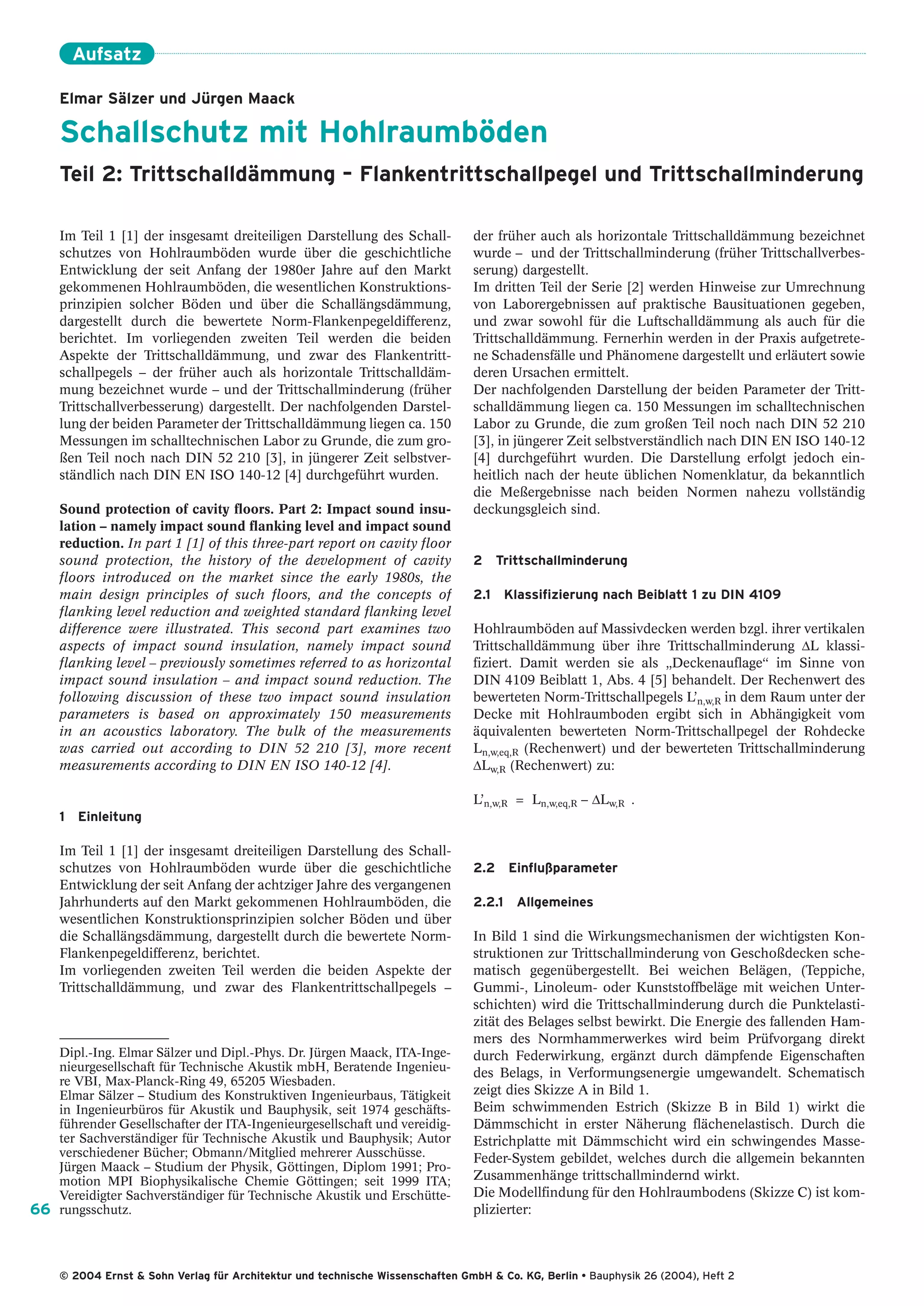 Der zweite Teil des Aufsatzes von Elmar Sälzer und Jürgen Maack befasst sich mit der Tritt Schalldämmung und -minderung von Hohlraumböden, wobei zwei Hauptaspekte analysiert werden: der Flankentrittschallpegels und die damit verbundene Tritt Schalldämmung. Anhand von etwa 150 Messungen werden die Auswirkungen verschiedener Konstruktionsprinzipien und Beläge auf die Schalldämmung dargestellt, sowie deren praktische Anwendung und Effektivität erörtert. Zudem werden Modelle zur Schalldämmung und deren Einflussfaktoren behandelt, um eine qualitative Einschätzung der akustischen Eigenschaften von Hohlraumböden zu ermöglichen.