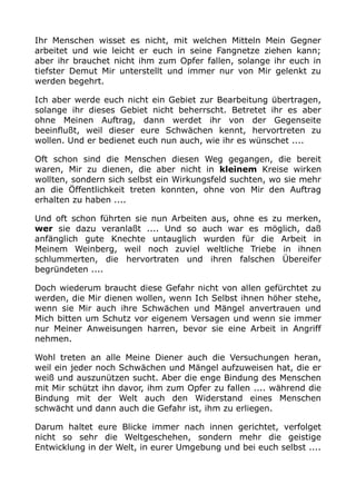 Das Dokument betont die Bedeutung der inneren Demut und des strikten Befolgens göttlicher Anweisungen für die 'Weinbergsarbeiter'. Übermäßiger Ehrgeiz und selbstgewählte Aufgaben können dazu führen, dass man von negativen Einflüssen beeinflusst wird, weshalb es wichtig ist, sich auf das Wesentliche zu konzentrieren und sich nicht von weltlichen Trieben leiten zu lassen. Letztlich wird empfohlen, in der eigenen spirituellen Entwicklung aktiv zu sein und anderen hilfreich zur Seite zu stehen, ohne sich von eigenen Ambitionen fernleiten zu lassen.